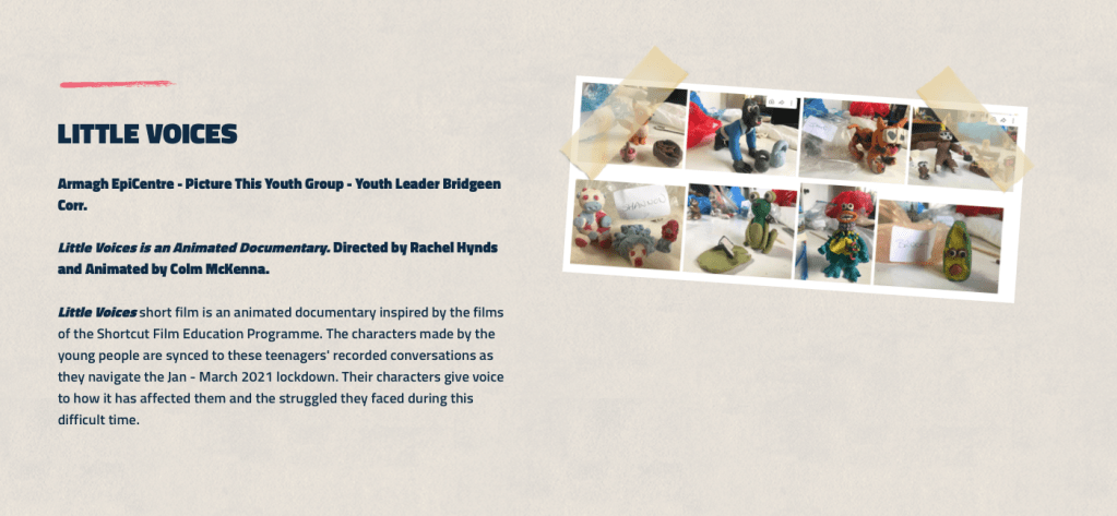 Workshop over zoom with a youth group in Armagh over 6 weeks. Participants created their own characters in a space that allowed them to talk about their emotions during the pandemic. The characters were then animated by a professional stop motion animator.